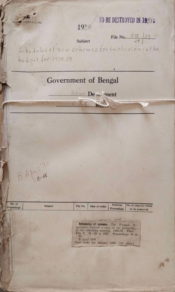 | Rack No. 08, Bundle No. 02, SI No. 128 The Bengal Jute Bill, 1938 by Mr. Rasik Lal Biswas, M.L.A. | Rack No. 08, Bundle No. 02, SI No. 129 Cancellation of order debarring Babu Tarapada Banarjee from obtaining any appointment under Government. | Rack No. 08, Bundle No. 02, SI No. 130 Exclusion from Govt. Service of Mr. Probath Ch. Bose, Late Clerk in the office of the Chief Accounts officer, Eastern Bengal Railway. | Rack No. 08, Bundle No. 02, SI No. 71 Schedules of new schemes for inclusion in the budget for 1938-39. | Rack No. 08, Bundle No. 02, SI No. 72 Preparation of a manual for the use of the members of the legislature. | Rack No. 08, Bundle No. 02, SI No. 73 Requirements of the Bengal Legislative Assembly Departments | Rack No. 08, Bundle No. 02, SI No. 74 Officiating arrangement in place of Rai Sahib K.P. Bose, Head Assistant Home (C+E) Department, during the period of his leave. |