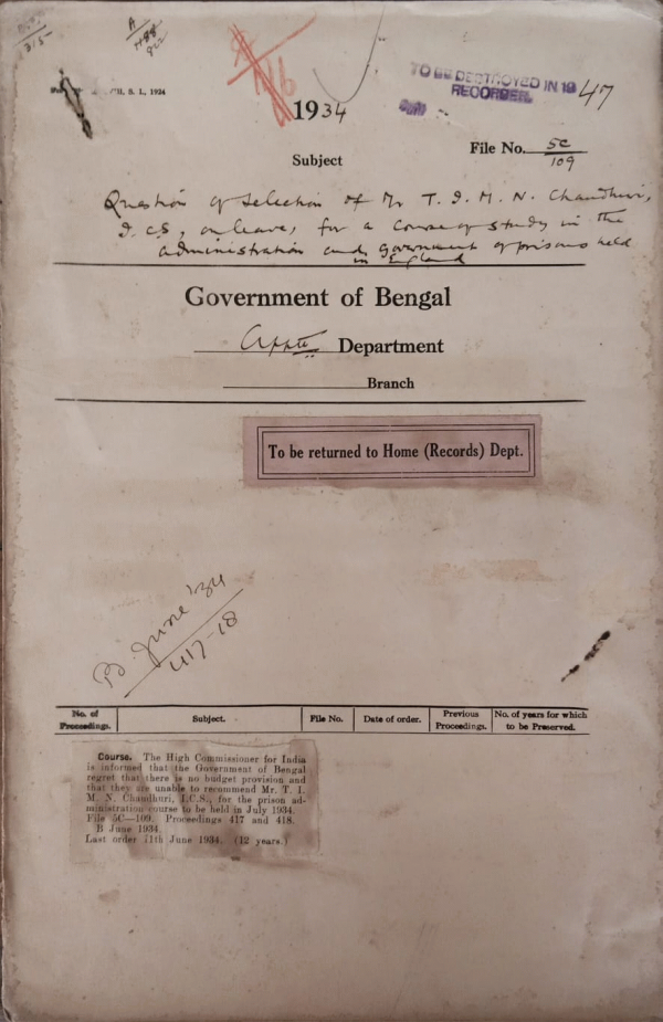 Question of selection of Mr. T.I. M.N. Chawdhury I.C.S. for the prison administration course held in England.