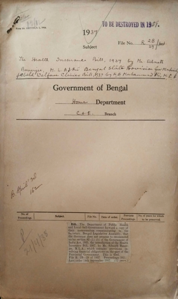 The Health Insurance Bill, 1937 by Mr. Sibnath Banerjee, M.L.A. and the Bengal State Provision for Maternity and Child welfare clinics Bill, 1937 by K.B. Muhammad Ali, M.L.A.