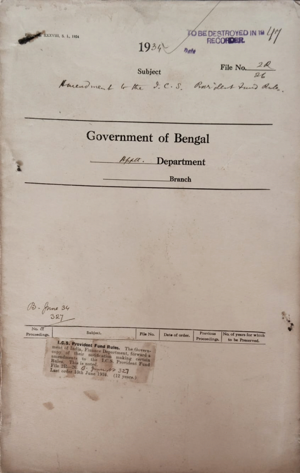 | Rack No. 2, Bundle No. 6, Sl No. 318 Procedure regarding petty repairs to fixtures and replacement of broken glasses in doors & windrows. | Rack No. 2, Bundle No. 6, Sl No. 319 Amendments to the G.P.F. Rules. | Rack No. 2, Bundle No. 6, Sl No. 320 Confirmation in the grade of District R.S Judges. | Rack No. 2, Bundle No. 6, Sl No. 321 Amendments to the I.C.S. provident Fund Rules. | Rack No. 2, Bundle No. 6, Sl No. 322 Grant of an advance from the G.P. Fund to Babu B.M. Ghosh, Deputy Magistrate + Deputy Collector + P.A. to the Commissioner, Dacca. | Rack No. 2, Bundle No. 6, Sl No. 323 List of officers enjoying rent free quarters. | Rack No. 2, Bundle No. 6, Sl No. 324 Authorization of Mr. K. Ali. Afzal, Assistant Secretary Bengal Legislative Council Department to exercise the function of the drawing officer and of the controlling in respect of all Charges of the Council Department |