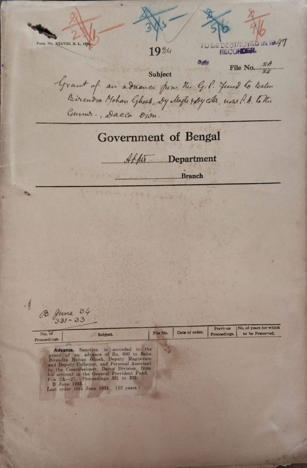 | Rack No. 2, Bundle No. 6, Sl No. 319 Amendments to the G.P.F. Rules. | Rack No. 2, Bundle No. 6, Sl No. 320 Confirmation in the grade of District R.S Judges. | Rack No. 2, Bundle No. 6, Sl No. 321 Amendments to the I.C.S. provident Fund Rules. | Rack No. 2, Bundle No. 6, Sl No. 322 Grant of an advance from the G.P. Fund to Babu B.M. Ghosh, Deputy Magistrate + Deputy Collector + P.A. to the Commissioner, Dacca. | Rack No. 2, Bundle No. 6, Sl No. 323 List of officers enjoying rent free quarters. | Rack No. 2, Bundle No. 6, Sl No. 324 Authorization of Mr. K. Ali. Afzal, Assistant Secretary Bengal Legislative Council Department to exercise the function of the drawing officer and of the controlling in respect of all Charges of the Council Department | Rack No. 2, Bundle No. 6, Sl No. 325 Report on the Administration of the words attached and Trust Estates the Bengal. |