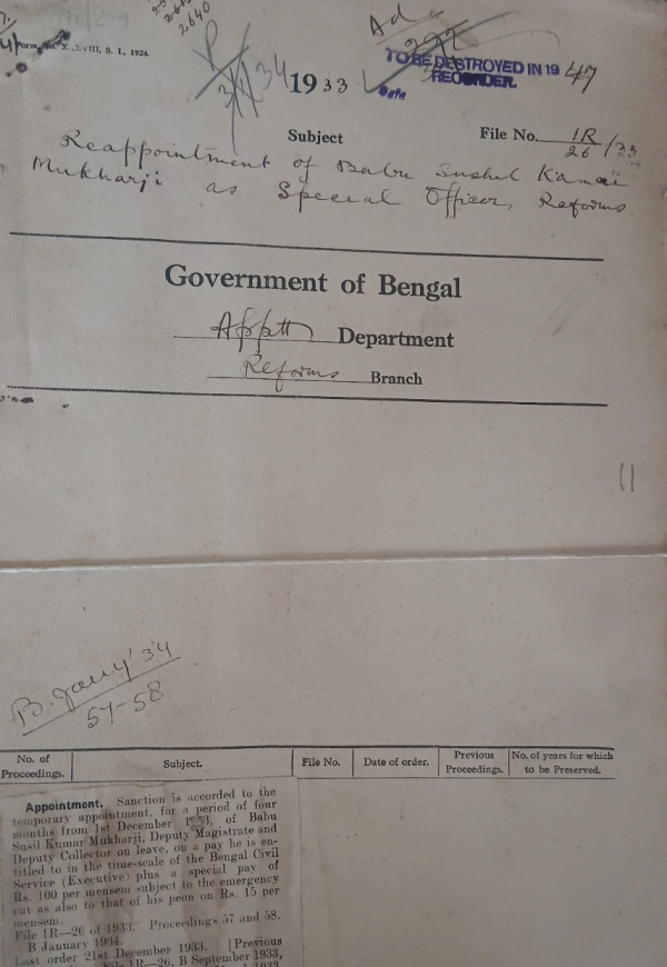Re-appointment of Babu Susil Kumar Mukharji, as special officer, Reforms.