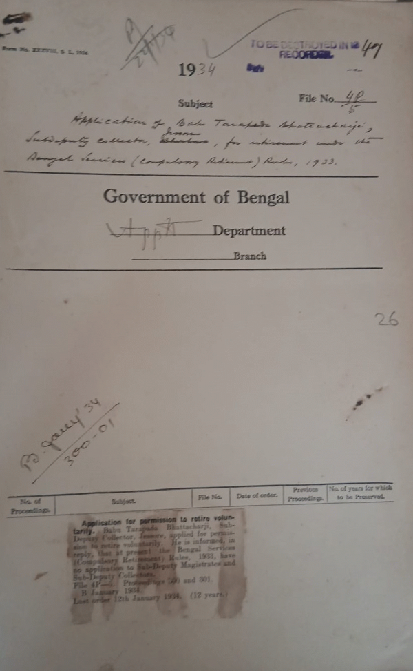 Application of Babu Tarapada Bhattacharji, Sub-Deputy. Collector Jessore, for retirement under the Bengal Services Rules, 1933.