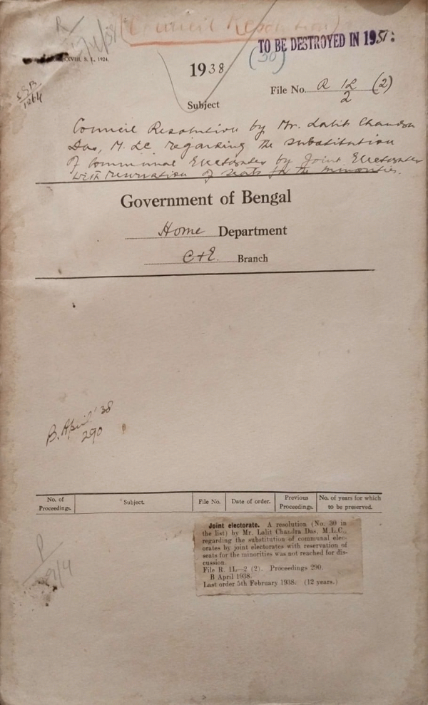 Council Resolution by Mr. Lalit Ch. Das M.L.C. regarding substitution of communal electorates by Joint Electorates with reservation of Seats for the Minorities.