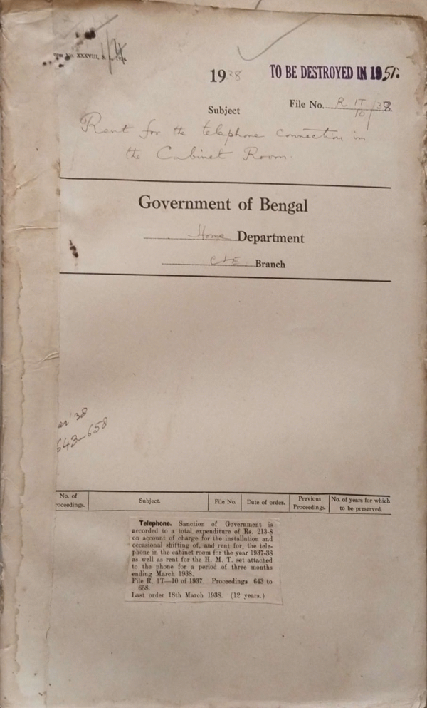 | Rack No. 08, Bundle No. 02, SI No. 111 Rebate on fares of air journeys performed by Govt. Servants. | Rack No. 08, Bundle No. 02, SI No. 112 Purchase of a cycle for the use of the cycle peon of the Bengal Legislative Council Department. | Rack No. 08, Bundle No. 02, SI No. 113 Proposal for purchase of Pigeon hole racks for keeping letters and paper intended for the members of the Bengal Legislative Assembly. | Rack No. 08, Bundle No. 02, SI No. 114 Rent for the telephone connection in the Cabinet Room. | Rack No. 08, Bundle No. 02, SI No. 115 Termination of free exchange of official Publication between India and His Majesty’s Govt. | Rack No. 08, Bundle No. 02, SI No. 116 Petition against the election of Mr. Anwarul Azim to the Bengal Legislative Assembly from the Chittagong South Muhammadan Constituency. | Rack No. 08, Bundle No. 02, SI No. 117 Employment of temporary Staff in the Tippera Collectorate for work in connection with the revision of electoral rolls of the Indian Legislative Assembly. |