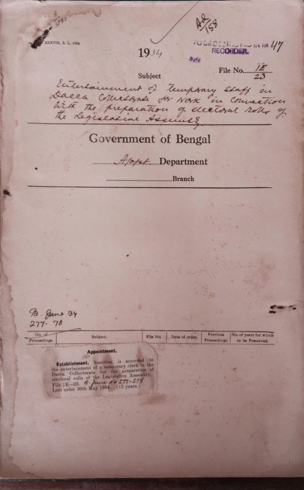 Establishment of temporary staff in Dacca Collectorate for the preparation of electoral rolls of the Legislative Assembly.