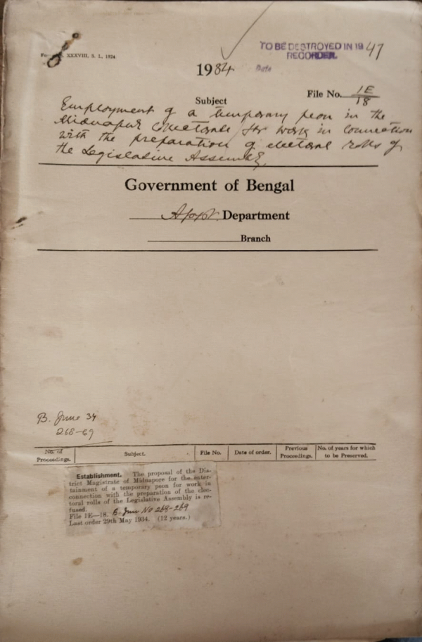 | Rack No. 2, Bundle No. 6, Sl No. 337 Establishment of temporary staff in Dacca Collectorate for the preparation of electoral rolls of the Legislative Assembly. | Rack No. 2, Bundle No. 6, Sl No. 338 Establishment of extra staff in the Faridpur Collectorate for the preparation of electoral rolls of the legislative Assembly. | Rack No. 2, Bundle No. 6, Sl No. 339 Posting of Mr. Muhammad Abar Abdullah I.P. to the I.B. | Rack No. 2, Bundle No. 6, Sl No. 340 Establishment of a temporary peon in the Midnapore collectorate for work in the preparation of the electoral rolls of the Legislative Assembly. | Rack No. 2, Bundle No. 6, Sl No. 341 Cost of publication of advertisement in the Bengal Civil List. | Rack No. 2, Bundle No. 6, Sl No. 342 Amendment to instructions regarding statements for the guidance of stamp Inspectors. | Rack No. 2, Bundle No. 6, Sl No. 343 Extension of probationary period of Mr. Sudhir Kumar Sinhai I. P., Assistant, Superintendent of Police. |