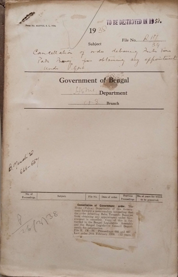 Cancellation of order debarring Babu Tarapada Banarjee from obtaining any appointment under Government.