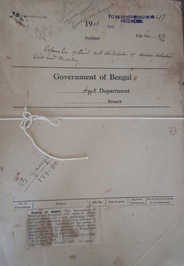 | Rack No. 2, Bundle No. 01, Sl No. 30 Grant of an advance from the G.P. fund to Babu Anadi Nath Sarkar Sub-Deputy collector, Tippera. | Rack No. 2, Bundle No. 01, Sl No. 31 Grant of honoraria to the examiners in connection with the Departmental Exam held in November, 1933. | Rack No. 2, Bundle No. 01, Sl No. 32 Sitting of the Medical Board in the office of the Surgeon Generals, writers Buildings, and Calcutta for the 8.1.34. | Rack No. 2, Bundle No. 01, Sl No. 33 Separation of Sind. | Rack No. 2, Bundle No. 01, Sl No. 34 Application for an advance from the I.C.S. Provident Fund (Case of Mv. E.W. Holland, I.C.S.) | Rack No. 2, Bundle No. 01, Sl No. 35 Recruitment of Bengalees in filling appointment under the Governmentof Bengal. | Rack No. 2, Bundle No. 01, Sl No. 36 Application of Babu Priya Ranjan Das Gupta, Sub-Deputy. Collector, Lalbagh, Murshidabad, for an advance from the G.P. Fund. |