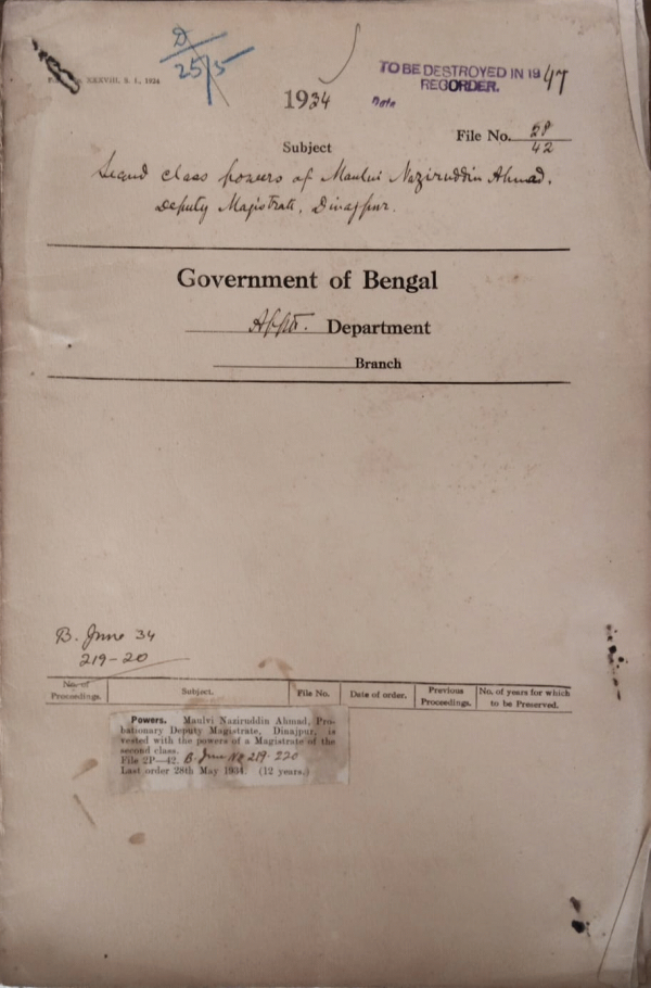 | Rack No. 2, Bundle No. 6, Sl No. 347 Appointment of the Revd. Joseph Kirkpatrick to be a Chaplain on probation on the Indian Eccl. Estt. | Rack No. 2, Bundle No. 6, Sl No. 348 Final withdrawal of the money at the Credit of Mr. T. Basu, Additional District & Session Judges Bakarganj in the G.P. Fund. | Rack No. 2, Bundle No. 6, Sl No. 349 Application of Maulvi Hafizur Rahman for an application or Return of Certificate Submitted with his petition in 1932. | Rack No. 2, Bundle No. 6, Sl No. 350 Second class powers of Maulvi Naziruddin Ahmed, Deputy Magistrate Dinajpur. | Rack No. 2, Bundle No. 6, Sl No. 351 Third class powers of Babu Sudhansu Kumar Banaji, Probationary Deputy Magistrate, Khulna. | Rack No. 2, Bundle No. 6, Sl No. 352 Central services (Emergency Deductions from pay) Rules, 1934. | Rack No. 2, Bundle No. 6, Sl No. 353 Grant of an advance from the G.P. Fund to Babu S.N. Sen, Sadar S.D.O., Rangamati. |