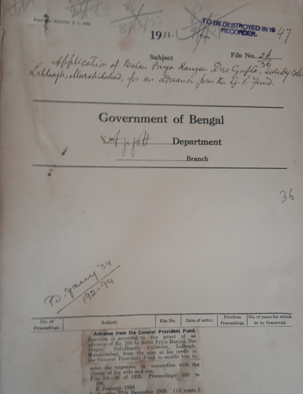Application of Babu Priya Ranjan Das Gupta, Sub-Deputy. Collector, Lalbagh, Murshidabad, for an advance from the G.P. Fund.