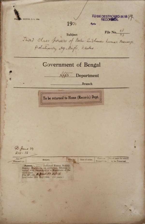 | Rack No. 2, Bundle No. 6, Sl No. 348 Final withdrawal of the money at the Credit of Mr. T. Basu, Additional District & Session Judges Bakarganj in the G.P. Fund. | Rack No. 2, Bundle No. 6, Sl No. 349 Application of Maulvi Hafizur Rahman for an application or Return of Certificate Submitted with his petition in 1932. | Rack No. 2, Bundle No. 6, Sl No. 350 Second class powers of Maulvi Naziruddin Ahmed, Deputy Magistrate Dinajpur. | Rack No. 2, Bundle No. 6, Sl No. 351 Third class powers of Babu Sudhansu Kumar Banaji, Probationary Deputy Magistrate, Khulna. | Rack No. 2, Bundle No. 6, Sl No. 352 Central services (Emergency Deductions from pay) Rules, 1934. | Rack No. 2, Bundle No. 6, Sl No. 353 Grant of an advance from the G.P. Fund to Babu S.N. Sen, Sadar S.D.O., Rangamati. | Rack No. 2, Bundle No. 6, Sl No. 354 Grant of an advance from the G.P. Fund to Khan Saheb Kazi Fazlul Karim, S.D.C. (on leave). |