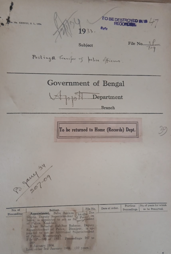 | Rack No. 2, Bundle No. 01, Sl No. 36 Application of Babu Priya Ranjan Das Gupta, Sub-Deputy. Collector, Lalbagh, Murshidabad, for an advance from the G.P. Fund. | Rack No. 2, Bundle No. 01, Sl No. 37 Assumption of charge by Sir Eddward Stubbs, G.C.M.G. of the Administration of the Governmentof Ceylon and its dependencies. | Rack No. 2, Bundle No. 01, Sl No. 38 Extension of leave of Babu Nalini Kamar Das Gupta, Sub-Deputy. Collector. | Rack No. 2, Bundle No. 01, Sl No. 39 Posting Transfer of Police officers. | Rack No. 2, Bundle No. 01, Sl No. 40 Appellate powers of Babu Radha Parasad Mukheji, Deputy. Magistrate, Alipore. | Rack No. 2, Bundle No. 01, Sl No. 41 Recruitment of the Indian Police in 1934. | Rack No. 2, Bundle No. 01, Sl No. 42 Grant of presidency house allowance to the Reverend C.G. Pearson, Senior Chaplain while on leave. |