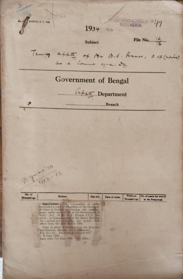 | Rack No. 2, Bundle No. 6, Sl No. 356 Attachment of pay of Babu S.M. Mitra, Deputy Collector, B. Baria. | Rack No. 2, Bundle No. 6, Sl No. 357 Date of promotion of Babu B.N. Das Gupta, Deputy Collector, above the lower efficiency bar. | Rack No. 2, Bundle No. 6, Sl No. 358 Rule regarding the confirmation of an officer in a post in advance of the fixing of the revised rate of pay. | Rack No. 2, Bundle No. 6, Sl No. 359 Temporary appointment of B.C. Prance I.C.S. (retired) as a commissioner of the Dacca Division. | Rack No. 2, Bundle No. 6, Sl No. 360 Appointment of Babu M.S. Ray, Sub-Judge + Assistant Session judge, Jessore as Additional Judge of the District. | Rack No. 2, Bundle No. 6, Sl No. 361 Cancellation of the leave granted to Mr. N. Das, I.C.S. Assistant Magistrate Rajshahi. | Rack No. 2, Bundle No. 6, Sl No. 362 Appointment of the Revds. T.B. Raudolph and A.G. Cowham as senior and Junior Chaplain of St. Paul's Cathedral, Calcutta. |