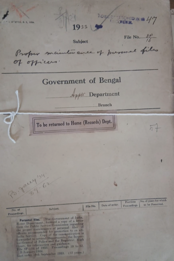 | Rack No. 2, Bundle No. 01, Sl No. 54 Result of the Indian Police Exam in the U.K. in 1933. | Rack No. 2, Bundle No. 01, Sl No. 55 Postings of Deputy. Magistrate in November 1933. | Rack No. 2, Bundle No. 01, Sl No. 56 Permission to Mr. H.J. Twynom I.C.S. commissioner, Presy. Division to extend his stay at Darjeeling. | Rack No. 2, Bundle No. 01, Sl No. 57 Proper maintenance of personal files of officers. | Rack No. 2, Bundle No. 01, Sl No. 58 Confirmation of Babu Anath Nath Ganguli, Deputy. Superintendent of Police, on probation. | Rack No. 2, Bundle No. 01, Sl No. 59 Nomination of official members to the Bengal Legislative council. | Rack No. 2, Bundle No. 01, Sl No. 60 Cold-weather postings of I.C.S. officers. |