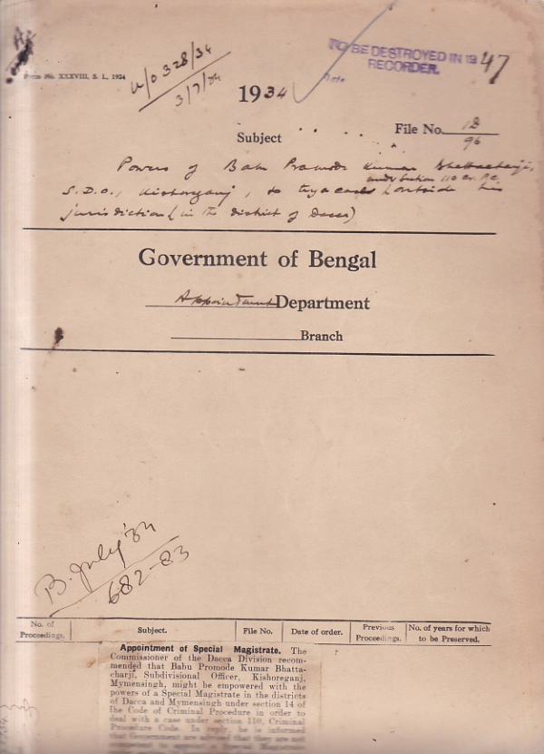 Appointment of Babu Promodi Kumar Bhattacharji S.D. Officer Kishoreganj Mymensingh as a special Magistrate.