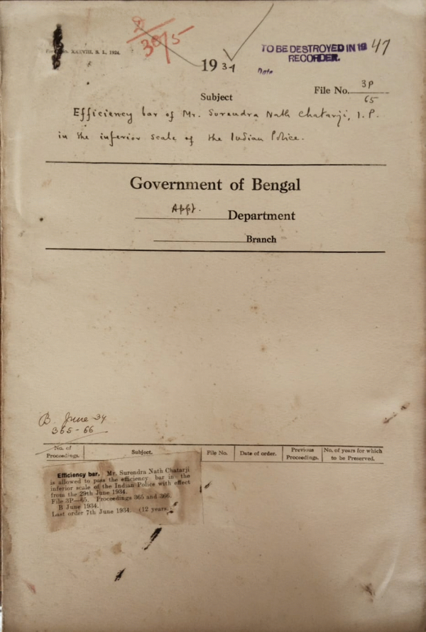| Rack No. 2, Bundle No. 6, Sl No. 365 Posting of Maulvi Salehuddin Ahmed, Sub-D.C. on revision to the general line. | Rack No. 2, Bundle No. 6, Sl No. 366 Report of the birth of a son to Mr. S. Banerjee, I.C.S. District Magistrate, Bakarganj. | Rack No. 2, Bundle No. 6, Sl No. 367 Application of Rai Jatindra Mohan Banerjee Bahdur, Magistrate & Collector, (on leave) for pension | Rack No. 2, Bundle No. 6, Sl No. 368 Efficiency bar of Mr. S.N. Chatarji, I.P. in the inferior scale of the Indian Police. | Rack No. 2, Bundle No. 6, Sl No. 369 Extension of a temporary post of Additional District Magistrate, Chittagong. | Rack No. 2, Bundle No. 6, Sl No. 370 Acceptance of private employment by Mr. H.E. Beal, I.C.S. (retired). | Rack No. 2, Bundle No. 7, Sl No. 371 Nomination to the Legislative Assembly. |