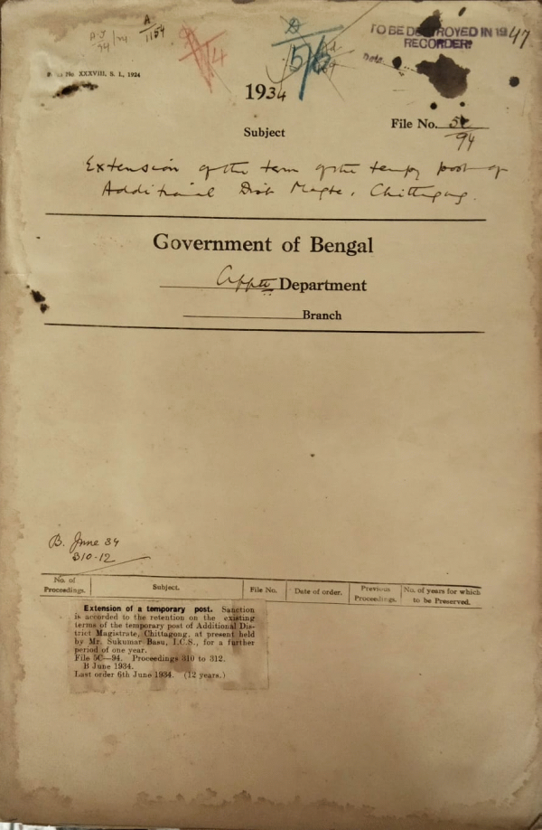| Rack No. 2, Bundle No. 6, Sl No. 366 Report of the birth of a son to Mr. S. Banerjee, I.C.S. District Magistrate, Bakarganj. | Rack No. 2, Bundle No. 6, Sl No. 367 Application of Rai Jatindra Mohan Banerjee Bahdur, Magistrate & Collector, (on leave) for pension | Rack No. 2, Bundle No. 6, Sl No. 368 Efficiency bar of Mr. S.N. Chatarji, I.P. in the inferior scale of the Indian Police. | Rack No. 2, Bundle No. 6, Sl No. 369 Extension of a temporary post of Additional District Magistrate, Chittagong. | Rack No. 2, Bundle No. 6, Sl No. 370 Acceptance of private employment by Mr. H.E. Beal, I.C.S. (retired). | Rack No. 2, Bundle No. 7, Sl No. 371 Nomination to the Legislative Assembly. | Rack No. 2, Bundle No. 7, Sl No. 372 Creation of temporary post for Mr. E.S. Simpson, I.C.S and Mulvi Emdad Ali. Deputy Magistrate and Deputy Collector, appointed president and member of a special Tribunal at Dinajpur. |