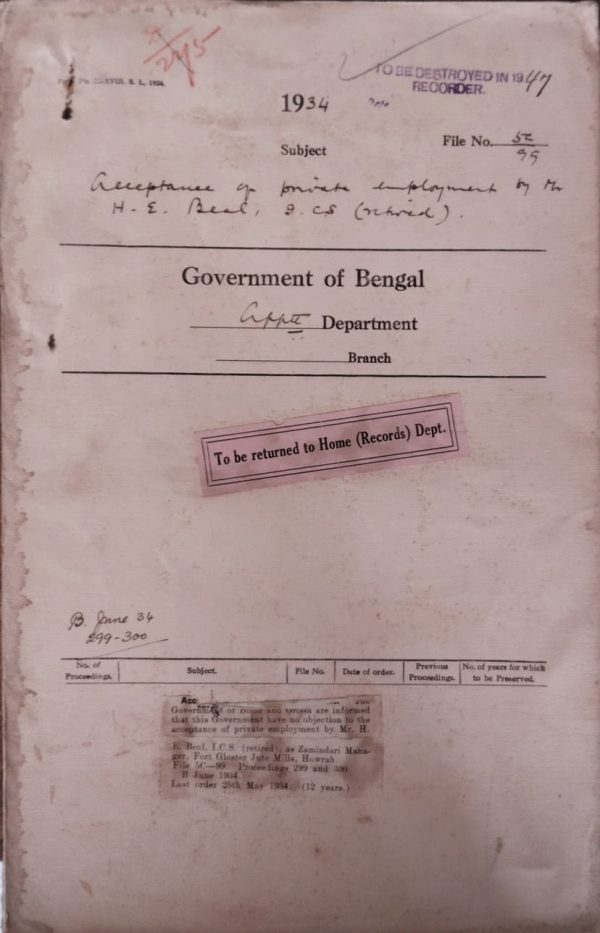 | Rack No. 2, Bundle No. 6, Sl No. 367 Application of Rai Jatindra Mohan Banerjee Bahdur, Magistrate & Collector, (on leave) for pension | Rack No. 2, Bundle No. 6, Sl No. 368 Efficiency bar of Mr. S.N. Chatarji, I.P. in the inferior scale of the Indian Police. | Rack No. 2, Bundle No. 6, Sl No. 369 Extension of a temporary post of Additional District Magistrate, Chittagong. | Rack No. 2, Bundle No. 6, Sl No. 370 Acceptance of private employment by Mr. H.E. Beal, I.C.S. (retired). | Rack No. 2, Bundle No. 7, Sl No. 371 Nomination to the Legislative Assembly. | Rack No. 2, Bundle No. 7, Sl No. 372 Creation of temporary post for Mr. E.S. Simpson, I.C.S and Mulvi Emdad Ali. Deputy Magistrate and Deputy Collector, appointed president and member of a special Tribunal at Dinajpur. | Rack No. 2, Bundle No. 7, Sl No. 373 Publication of the Bengal Civil list in May and November instead of in January and July. |