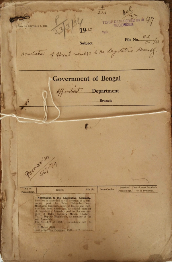 | Rack No. 2, Bundle No. 6, Sl No. 368 Efficiency bar of Mr. S.N. Chatarji, I.P. in the inferior scale of the Indian Police. | Rack No. 2, Bundle No. 6, Sl No. 369 Extension of a temporary post of Additional District Magistrate, Chittagong. | Rack No. 2, Bundle No. 6, Sl No. 370 Acceptance of private employment by Mr. H.E. Beal, I.C.S. (retired). | Rack No. 2, Bundle No. 7, Sl No. 371 Nomination to the Legislative Assembly. | Rack No. 2, Bundle No. 7, Sl No. 372 Creation of temporary post for Mr. E.S. Simpson, I.C.S and Mulvi Emdad Ali. Deputy Magistrate and Deputy Collector, appointed president and member of a special Tribunal at Dinajpur. | Rack No. 2, Bundle No. 7, Sl No. 373 Publication of the Bengal Civil list in May and November instead of in January and July. | Rack No. 2, Bundle No. 7, Sl No. 374 Election to the women's seat in the Federal Lower House. |