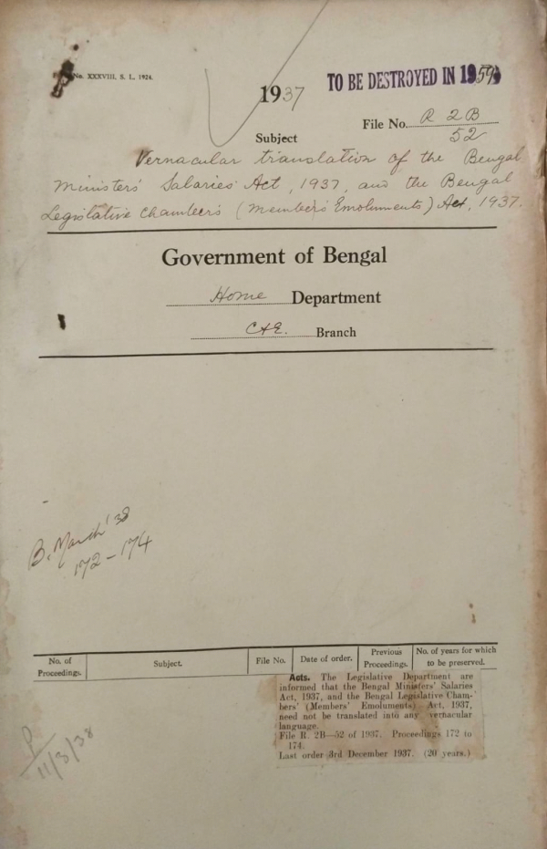 | Rack No. 08, Bundle No. 03, SI No. 136 Revision of electoral rolls of the Indian Legislative Assembly. | Rack No. 08, Bundle No. 03, SI No. 137 The Bengal Jute Bill, 1937 by Mr. Surendra Nath Biswas M.L.A. | Rack No. 08, Bundle No. 03, SI No. 138 Address of welcome to H/E by the Indian Association. | Rack No. 08, Bundle No. 03, SI No. 139 Vernacular translation of the Bengal Ministers Sallies act 1937 and the Bengal Legislative Chambers Act, 1937. | Rack No. 08, Bundle No. 03, SI No. 140 Purchase of Cain articles of furniture for the use of the staff of the Bengal Legislative Assembly Department. | Rack No. 08, Bundle No. 03, SI No. 141 The Bengal Tenancy Bills, 1937 by Mr. P. Benerji M.L.A. | Rack No. 08, Bundle No. 03, SI No. 142 Electoral Rules of the Provinces. |