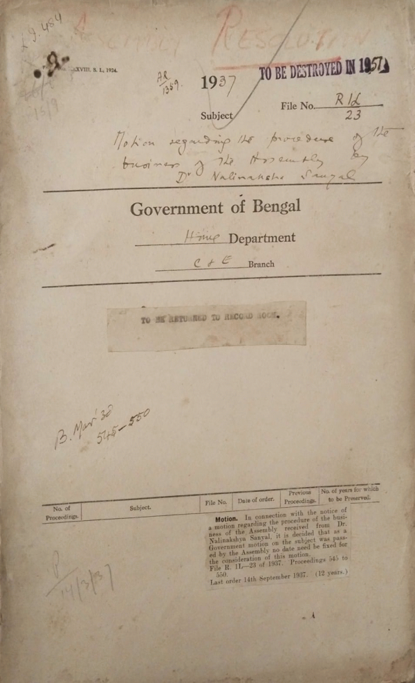 | Rack No. 08, Bundle No. 03, SI No. 141 The Bengal Tenancy Bills, 1937 by Mr. P. Benerji M.L.A. | Rack No. 08, Bundle No. 03, SI No. 142 Electoral Rules of the Provinces. | Rack No. 08, Bundle No. 03, SI No. 143 Objection of the High Court to Building of the council chamber in front of the High Court Building. | Rack No. 08, Bundle No. 03, SI No. 144 Motion regarding the procedure of the business of the Assembly by Dr. Nalinakshya Sanyal. | Rack No. 08, Bundle No. 03, SI No. 145 Bye-election in the Indian Jute Mills Association Constituency of the Bengal Legislation Assembly. | Rack No. 08, Bundle No. 03, SI No. 146 Supply of certain articles for the use of the Election Tribunal. | Rack No. 08, Bundle No. 03, SI No. 147 Appropriations and re-appropriations in H.E. Authorization budget 1937-38. |
