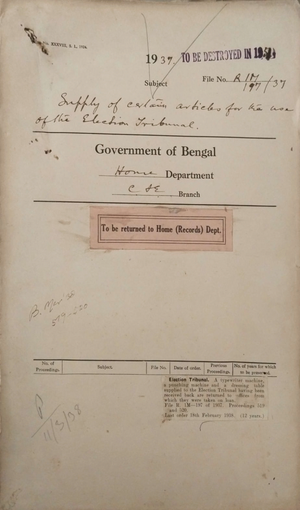| Rack No. 08, Bundle No. 03, SI No. 143 Objection of the High Court to Building of the council chamber in front of the High Court Building. | Rack No. 08, Bundle No. 03, SI No. 144 Motion regarding the procedure of the business of the Assembly by Dr. Nalinakshya Sanyal. | Rack No. 08, Bundle No. 03, SI No. 145 Bye-election in the Indian Jute Mills Association Constituency of the Bengal Legislation Assembly. | Rack No. 08, Bundle No. 03, SI No. 146 Supply of certain articles for the use of the Election Tribunal. | Rack No. 08, Bundle No. 03, SI No. 147 Appropriations and re-appropriations in H.E. Authorization budget 1937-38. | Rack No. 08, Bundle No. 03, SI No. 148 Appointment of a Stenographer for Bengal Legislative Council | Rack No. 08, Bundle No. 03, SI No. 149 Resolution passed at the Annual Conference of the Calcutta Namasudara Association. |