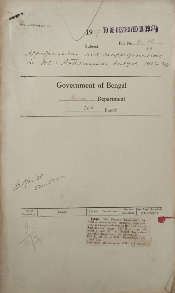 | Rack No. 08, Bundle No. 03, SI No. 144 Motion regarding the procedure of the business of the Assembly by Dr. Nalinakshya Sanyal. | Rack No. 08, Bundle No. 03, SI No. 145 Bye-election in the Indian Jute Mills Association Constituency of the Bengal Legislation Assembly. | Rack No. 08, Bundle No. 03, SI No. 146 Supply of certain articles for the use of the Election Tribunal. | Rack No. 08, Bundle No. 03, SI No. 147 Appropriations and re-appropriations in H.E. Authorization budget 1937-38. | Rack No. 08, Bundle No. 03, SI No. 148 Appointment of a Stenographer for Bengal Legislative Council | Rack No. 08, Bundle No. 03, SI No. 149 Resolution passed at the Annual Conference of the Calcutta Namasudara Association. | Rack No. 08, Bundle No. 03, SI No. 150 Amendment to the Bengal Public Service Commission Regulations, 1937. |