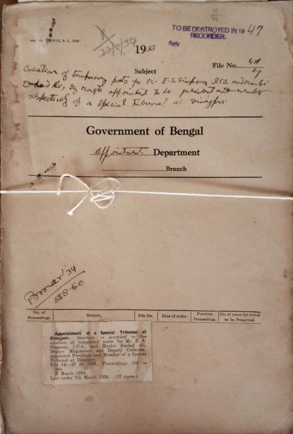 Creation of temporary post for Mr. E.S. Simpson, I.C.S and Mulvi Emdad Ali. Deputy Magistrate and Deputy Collector, appointed president and member of a special Tribunal at Dinajpur.