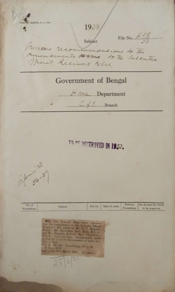 | Rack No. 08, Bundle No. 03, SI No. 155 Rate of Washing allowances liveried menials employed in the offices of the Head of Departments in Calcutta. | Rack No. 08, Bundle No. 03, SI No. 156 Correction to debarring Madhusudan Das, Inferior Income Tax Department, Bengal Madhusudan Das, Calcutta from Service Bar to re-employment. | Rack No. 08, Bundle No. 03, SI No. 157 Posting of audit” Vis a Vis departmental officers in the matter of inspection. | Rack No. 08, Bundle No. 03, SI No. 158 The Calcutta official Receiver’s Bill, 1938. | Rack No. 08, Bundle No. 03, SI No. 159 Lower division selection grade post in the Bengal Legislative Assembly Department. | Rack No. 08, Bundle No. 03, SI No. 160 Installation of light over Teller’s Boxes in the Bengal Legislative Chamber. | Rack No. 08, Bundle No. 03, SI No. 161 Corrigenda to F.R. from No. 3. |