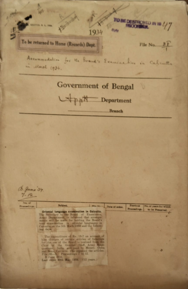 | Rack No. 2, Bundle No. 7, Sl No. 373 Publication of the Bengal Civil list in May and November instead of in January and July. | Rack No. 2, Bundle No. 7, Sl No. 374 Election to the women's seat in the Federal Lower House. | Rack No. 2, Bundle No. 7, Sl No. 375 Death report and payment of arrear pay of Babu Phani Bhusan Chakrabatti Deputy Magistrate and Deputy Collector, Tangail. | Rack No. 2, Bundle No. 7, Sl No. 376 Accommodation for the Board's Examination in Calcutta in March 1934. | Rack No. 2, Bundle No. 7, Sl No. 377 Posting of Deputy Magistrate and Deputy Collector (April, 1934). | Rack No. 2, Bundle No. 7, Sl No. 378 Supply of vernacular newspapers for the use of the Civil Service Commission London. | Rack No. 2, Bundle No. 7, Sl No. 379 Representation of Indian commerce and Industry in the reformed Bengal Legislative council. |