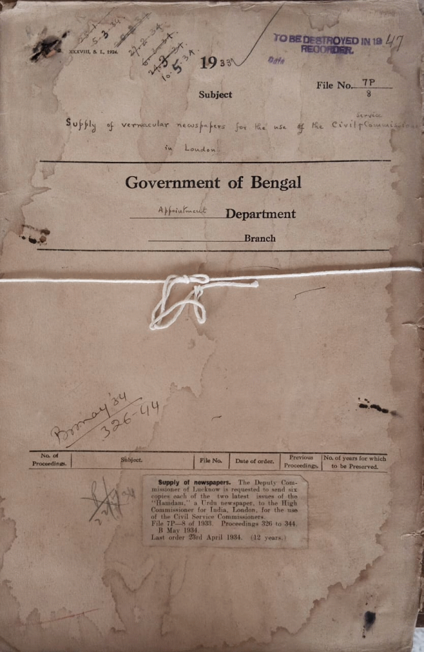 | Rack No. 2, Bundle No. 7, Sl No. 375 Death report and payment of arrear pay of Babu Phani Bhusan Chakrabatti Deputy Magistrate and Deputy Collector, Tangail. | Rack No. 2, Bundle No. 7, Sl No. 376 Accommodation for the Board's Examination in Calcutta in March 1934. | Rack No. 2, Bundle No. 7, Sl No. 377 Posting of Deputy Magistrate and Deputy Collector (April, 1934). | Rack No. 2, Bundle No. 7, Sl No. 378 Supply of vernacular newspapers for the use of the Civil Service Commission London. | Rack No. 2, Bundle No. 7, Sl No. 379 Representation of Indian commerce and Industry in the reformed Bengal Legislative council. | Rack No. 2, Bundle No. 7, Sl No. 380 Adoption of the memorandum form in ordinary correspondence. | Rack No. 2, Bundle No. 7, Sl No. 381 Provision of Articles for termination of the agreement on contract for non-permanent service. |