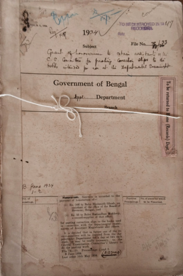 | Rack No. 2, Bundle No. 7, Sl No. 379 Representation of Indian commerce and Industry in the reformed Bengal Legislative council. | Rack No. 2, Bundle No. 7, Sl No. 380 Adoption of the memorandum form in ordinary correspondence. | Rack No. 2, Bundle No. 7, Sl No. 381 Provision of Articles for termination of the agreement on contract for non-permanent service. | Rack No. 2, Bundle No. 7, Sl No. 382 Grant of honorarium to certain assistants of the C.E. Committee for posting correction slips to the books intended for Department Examination | Rack No. 2, Bundle No. 7, Sl No. 383 Postings of certain police officers, (Posting of Mr. Sudhir Kumar Sinha and Fazlur Rahman Khondkar). | Rack No. 2, Bundle No. 7, Sl No. 384 Second class powers of Babu Promote Ranjan Das Gupta Midnapore. | Rack No. 2, Bundle No. 7, Sl No. 385 Indebtedness of Babu Sisir Kumar Kar, Sub-Deputy Collector, Murshidabad. |