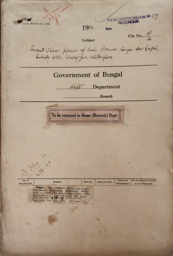 | Rack No. 2, Bundle No. 7, Sl No. 381 Provision of Articles for termination of the agreement on contract for non-permanent service. | Rack No. 2, Bundle No. 7, Sl No. 382 Grant of honorarium to certain assistants of the C.E. Committee for posting correction slips to the books intended for Department Examination | Rack No. 2, Bundle No. 7, Sl No. 383 Postings of certain police officers, (Posting of Mr. Sudhir Kumar Sinha and Fazlur Rahman Khondkar). | Rack No. 2, Bundle No. 7, Sl No. 384 Second class powers of Babu Promote Ranjan Das Gupta Midnapore. | Rack No. 2, Bundle No. 7, Sl No. 385 Indebtedness of Babu Sisir Kumar Kar, Sub-Deputy Collector, Murshidabad. | Rack No. 2, Bundle No. 7, Sl No. 386 Proposed extension of tenure of Capt. VV.G. Barker, I.A. and Assistant Commandant, in the E.F. Rifles, Dacca. | Rack No. 2, Bundle No. 7, Sl No. 387 Subscription for correction slips to the C.S.R. |