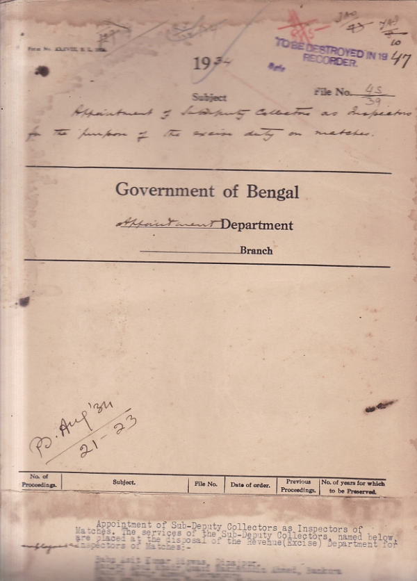 | Rack No. 02, Bundle No. 11, Sl No. 688 Pay of Babu Girindra Nath Banerji Head Assistant Police Department. | Rack No. 02, Bundle No. 11, Sl No. 689 Special pay of any Governmentservant holding a permanent post. | Rack No. 02, Bundle No. 11, Sl No. 690 Requisition of the Government Assistant for a judicial office for appointment as a district and session Judge. | Rack No. 02, Bundle No. 11, Sl No. 691 Appointment of Sub-Deputy collectors as inspectors of Matches of the excise duty on matches. | Rack No. 02, Bundle No. 11, Sl No. 692 Statement of landed properly owned by officers of the Dacca Division. | Rack No. 02, Bundle No. 11, Sl No. 693 Arrear pay and provident fund money of the late Sir W.D.R. Prentice K.C.I.E. | Rack No. 02, Bundle No. 11, Sl No. 694 Arrear leave salary due to the late Tuni Mirza of the Indian Police. |
