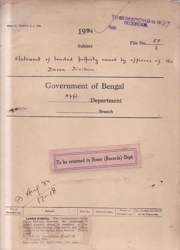 | Rack No. 02, Bundle No. 11, Sl No. 689 Special pay of any Governmentservant holding a permanent post. | Rack No. 02, Bundle No. 11, Sl No. 690 Requisition of the Government Assistant for a judicial office for appointment as a district and session Judge. | Rack No. 02, Bundle No. 11, Sl No. 691 Appointment of Sub-Deputy collectors as inspectors of Matches of the excise duty on matches. | Rack No. 02, Bundle No. 11, Sl No. 692 Statement of landed properly owned by officers of the Dacca Division. | Rack No. 02, Bundle No. 11, Sl No. 693 Arrear pay and provident fund money of the late Sir W.D.R. Prentice K.C.I.E. | Rack No. 02, Bundle No. 11, Sl No. 694 Arrear leave salary due to the late Tuni Mirza of the Indian Police. | Rack No. 02, Bundle No. 11, Sl No. 695 Statement of lauded properly owned by officers of the Rajshahi Division. |