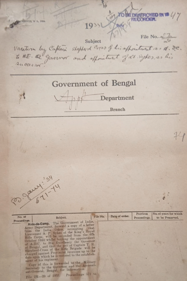 | Rack No. 2, Bundle No. 02, Sl No. 71 Report of the Orissa administration Committee. | Rack No. 2, Bundle No. 02, Sl No. 72 Leave temporary retirement of Mr. Probodh Chandra Ray, AdditionalDistrict 24 Parganas. | Rack No. 2, Bundle No. 02, Sl No. 73 Presentation of a silver plate to the Honorable Mr. Justice S.C. Mallik, I.C.S | Rack No. 2, Bundle No. 02, Sl No. 74 Vacation by Captain Shepherd Crass of his appointment as A.D.C. to H.E. the Governor and appointment of lieutenant Sykes as his successor. | Rack No. 2, Bundle No. 02, Sl No. 75 Appointment of Babu Harendra Chadra Barari, Sub-Deputy Collector as a curator to the estate fo late Mohanta Bhubagiri Gossain of Sherpur Math in the District of Bogra. | Rack No. 2, Bundle No. 02, Sl No. 76 Confirmation of Mr. J. George I.C.S. as undersecretary political and Appointment Department. | Rack No. 2, Bundle No. 02, Sl No. 77 Transfer of Deputy Magistrate and Deputy Collector who have been vested with the powers of Assistant Sessionions Judge. |