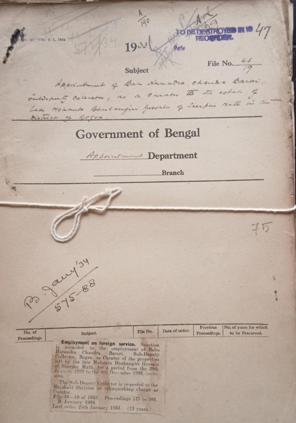 Appointment of Babu Harendra Chadra Barari, Sub-Deputy Collector as a curator to the estate fo late Mohanta Bhubagiri Gossain of Sherpur Math in the District of Bogra.