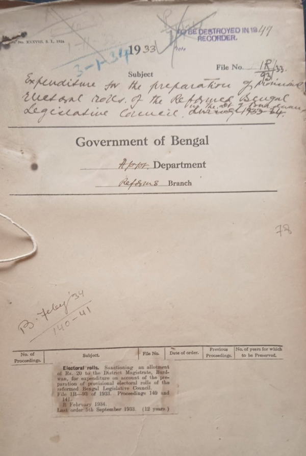 | Rack No. 2, Bundle No. 02, Sl No. 75 Appointment of Babu Harendra Chadra Barari, Sub-Deputy Collector as a curator to the estate fo late Mohanta Bhubagiri Gossain of Sherpur Math in the District of Bogra. | Rack No. 2, Bundle No. 02, Sl No. 76 Confirmation of Mr. J. George I.C.S. as undersecretary political and Appointment Department. | Rack No. 2, Bundle No. 02, Sl No. 77 Transfer of Deputy Magistrate and Deputy Collector who have been vested with the powers of Assistant Sessionions Judge. | Rack No. 2, Bundle No. 02, Sl No. 78 Expenditure under the land "22 General Administration Elections for Indian and Provincial Legislatures". | Rack No. 2, Bundle No. 02, Sl No. 79 Schedules of New Schemes for inclusion in the Budget for 1934-35. | Rack No. 2, Bundle No. 02, Sl No. 80 Extension of leave of Babu Phani Bhusan Ghosh, Sub-Deputy Collector. | Rack No. 2, Bundle No. 02, Sl No. 81 Particulars up premature retirement of I.C.S. Officers. |