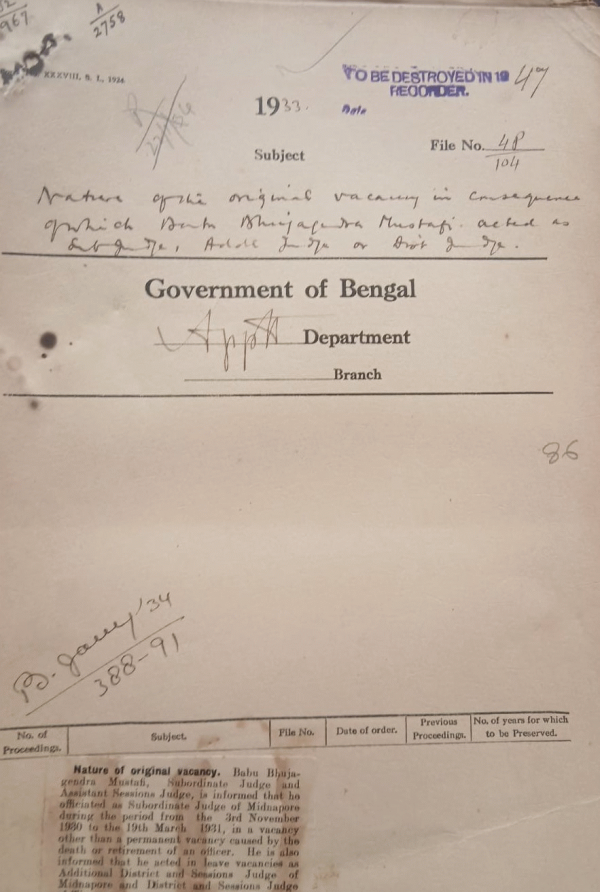 | Rack No. 2, Bundle No. 02, Sl No. 83 Military training of Mr. H.G.S. Bivar, I.C.S. Districtand Sessionions Murshidabad. | Rack No. 2, Bundle No. 02, Sl No. 84 Compilation of accounts by primary units only instead of by detailed heads. | Rack No. 2, Bundle No. 02, Sl No. 85 Tours of visitation of the precedence senior captain Church of Scotland, Bengal. | Rack No. 2, Bundle No. 02, Sl No. 86 Natural of the Original Vacancy in consequence of which Babu Bhujagendra Mustafi acted as Subordinate Judge and AdditionalJudge or District Judge. | Rack No. 2, Bundle No. 02, Sl No. 87 Appointment of an officer in finance Department for Sectt. Training. | Rack No. 2, Bundle No. 02, Sl No. 88 Leave of Mr. A.H. Quraishia new civilian posted to Murshidabad | Rack No. 2, Bundle No. 02, Sl No. 89 Grant of Railway concessions to the personnel of the Army in India on leave or furlough in grant Britain. |