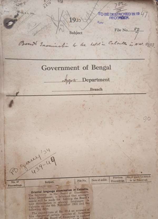 | Rack No. 2, Bundle No. 02, Sl No. 87 Appointment of an officer in finance Department for Sectt. Training. | Rack No. 2, Bundle No. 02, Sl No. 88 Leave of Mr. A.H. Quraishia new civilian posted to Murshidabad | Rack No. 2, Bundle No. 02, Sl No. 89 Grant of Railway concessions to the personnel of the Army in India on leave or furlough in grant Britain. | Rack No. 2, Bundle No. 02, Sl No. 90 Boards Examination to the held in Calcutta on the 6th November 1933. | Rack No. 2, Bundle No. 02, Sl No. 91 Powers of Maulvi Diwan Naimul Haque Deputy Magistrate Bakarganj. | Rack No. 2, Bundle No. 02, Sl No. 92 Amendment to the Superior Civil Services Rules. | Rack No. 2, Bundle No. 02, Sl No. 93 Indian Civil Service Examination London, 1933. |