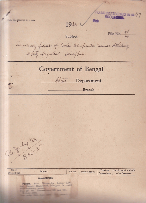 Summary powers of Babu Bhupendra Kumar Adhikari Deputy Magistrate Dinajpur.
