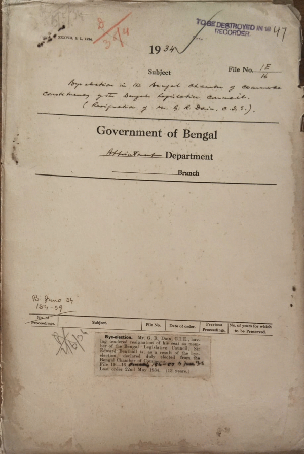 | Rack No. 2, Bundle No. 7, Sl No. 393 Death report of Sir William Prentice, Member executive council. | Rack No. 2, Bundle No. 7, Sl No. 394 Fixation of the rate of contribution by Governmentto the accountable of a subscriber to the contributory provident Fund. | Rack No. 2, Bundle No. 7, Sl No. 396 Proposed discontinuance of pompously Subscription to provident Fund. | Rack No. 2, Bundle No. 7, Sl No. 398 Appointment of Mr. A.G.R. Henderson, I.C.S. on leave as an officiating Judge of the Calcutta High Court | Rack No. 2, Bundle No. 7, Sl No. 399 Extension of temporary post of Mulvi Mirza Yahya Shirazi, by Magistrate and Deputy Collector | Rack No. 2, Bundle No. 7, Sl No. 400 Extension on leave of Babu Kumud Bihari Mallik, Deputy Magistrate and Deputy Collector. | Rack No. 2, Bundle No. 7, Sl No. 401 Grant of an advance to Mr. S.N. Guha Roy, I.C.S. from the I.C.S. Provident Fund for purchasing a motor car. |