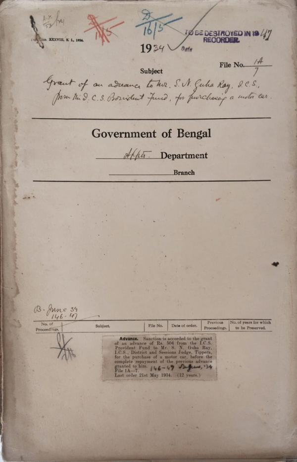 | Rack No. 2, Bundle No. 7, Sl No. 398 Appointment of Mr. A.G.R. Henderson, I.C.S. on leave as an officiating Judge of the Calcutta High Court | Rack No. 2, Bundle No. 7, Sl No. 399 Extension of temporary post of Mulvi Mirza Yahya Shirazi, by Magistrate and Deputy Collector | Rack No. 2, Bundle No. 7, Sl No. 400 Extension on leave of Babu Kumud Bihari Mallik, Deputy Magistrate and Deputy Collector. | Rack No. 2, Bundle No. 7, Sl No. 401 Grant of an advance to Mr. S.N. Guha Roy, I.C.S. from the I.C.S. Provident Fund for purchasing a motor car. | Rack No. 2, Bundle No. 7, Sl No. 402 Appointment of a special Tribunal at Bakarganj. | Rack No. 2, Bundle No. 7, Sl No. 403 Posting of Assistant Superintendent of Police (Messrs. D.S. Maxted and L.H. Lewisohn). | Rack No. 2, Bundle No. 7, Sl No. 404 Appointment of Mr. P.L. Mahta, I.P. as S.D.P.O., Narayanganj, Dacca. |