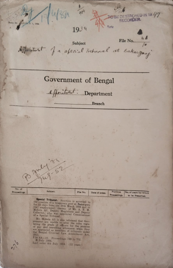 | Rack No. 2, Bundle No. 7, Sl No. 399 Extension of temporary post of Mulvi Mirza Yahya Shirazi, by Magistrate and Deputy Collector | Rack No. 2, Bundle No. 7, Sl No. 400 Extension on leave of Babu Kumud Bihari Mallik, Deputy Magistrate and Deputy Collector. | Rack No. 2, Bundle No. 7, Sl No. 401 Grant of an advance to Mr. S.N. Guha Roy, I.C.S. from the I.C.S. Provident Fund for purchasing a motor car. | Rack No. 2, Bundle No. 7, Sl No. 402 Appointment of a special Tribunal at Bakarganj. | Rack No. 2, Bundle No. 7, Sl No. 403 Posting of Assistant Superintendent of Police (Messrs. D.S. Maxted and L.H. Lewisohn). | Rack No. 2, Bundle No. 7, Sl No. 404 Appointment of Mr. P.L. Mahta, I.P. as S.D.P.O., Narayanganj, Dacca. | Rack No. 2, Bundle No. 7, Sl No. 405 Summer powers of Mr. D.L. Mazumdar, I.C.S. Joint Magistrate, and S.D.O., Serajganj, Dacca. |