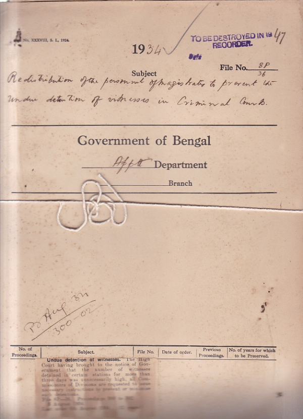 | Rack No. 02, Bundle No. 12, Sl No. 706 Memorial of Rai, J.M. Mitra Bahadur, late R.C.S. Bengal, against his removal for Government Service. | Rack No. 02, Bundle No. 12, Sl No. 707 Civil Suit against khan Sahib Abdul Majid, No. III. Late S.D.O. Gaibandha, Rangpur. | Rack No. 02, Bundle No. 12, Sl No. 708 Attachment of pay of Mulvi Muhammad Ilahdad, Sub-Deputy Collector and civil officer, 24-Parganas. | Rack No. 02, Bundle No. 12, Sl No. 709 Detention of witnesses over 3 days. | Rack No. 02, Bundle No. 12, Sl No. 710 Superior civil and central services (India Provident Fund) (Steeling Accounts) Rules. | Rack No. 02, Bundle No. 12, Sl No. 711 Promotion of Deputy Collector above the upper efficiency bar. | Rack No. 02, Bundle No. 12, Sl No. 712 Exclusion from Government Service of Mr. Hara Prashad Roy for submitting a falsified certificate as proof of his age. |