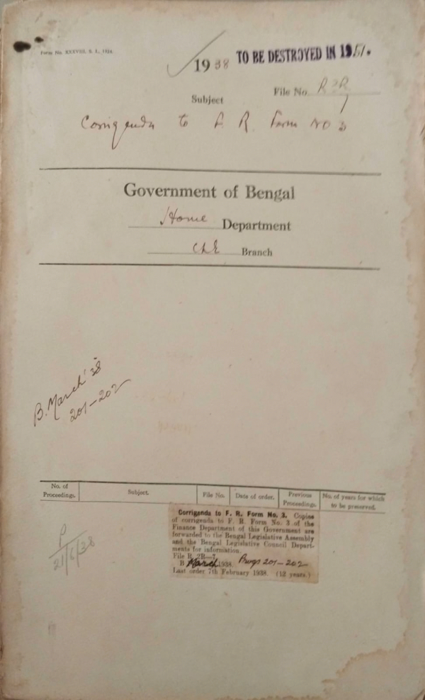 | Rack No. 08, Bundle No. 03, SI No. 158 The Calcutta official Receiver’s Bill, 1938. | Rack No. 08, Bundle No. 03, SI No. 159 Lower division selection grade post in the Bengal Legislative Assembly Department. | Rack No. 08, Bundle No. 03, SI No. 160 Installation of light over Teller’s Boxes in the Bengal Legislative Chamber. | Rack No. 08, Bundle No. 03, SI No. 161 Corrigenda to F.R. from No. 3. | Rack No. 08, Bundle No. 03, SI No. 162 Purchase of a new Diary Rubber Stamp for the use of the Home Department. | Rack No. 08, Bundle No. 03, SI No. 163 Utilization of Judicial officers on Election work. | Rack No. 08, Bundle No. 03, SI No. 164 By Election in the Bengal Chamber of Commerce Constancy of the Bengal Legislation Assembly. |