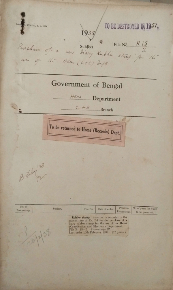 | Rack No. 08, Bundle No. 03, SI No. 159 Lower division selection grade post in the Bengal Legislative Assembly Department. | Rack No. 08, Bundle No. 03, SI No. 160 Installation of light over Teller’s Boxes in the Bengal Legislative Chamber. | Rack No. 08, Bundle No. 03, SI No. 161 Corrigenda to F.R. from No. 3. | Rack No. 08, Bundle No. 03, SI No. 162 Purchase of a new Diary Rubber Stamp for the use of the Home Department. | Rack No. 08, Bundle No. 03, SI No. 163 Utilization of Judicial officers on Election work. | Rack No. 08, Bundle No. 03, SI No. 164 By Election in the Bengal Chamber of Commerce Constancy of the Bengal Legislation Assembly. | Rack No. 08, Bundle No. 03, SI No. 165 Half yearly return showing condonation of deficiencies service qualifying for pension. |