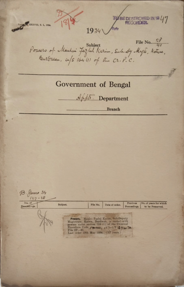 | Rack No. 2, Bundle No. 7, Sl No. 403 Posting of Assistant Superintendent of Police (Messrs. D.S. Maxted and L.H. Lewisohn). | Rack No. 2, Bundle No. 7, Sl No. 404 Appointment of Mr. P.L. Mahta, I.P. as S.D.P.O., Narayanganj, Dacca. | Rack No. 2, Bundle No. 7, Sl No. 405 Summer powers of Mr. D.L. Mazumdar, I.C.S. Joint Magistrate, and S.D.O., Serajganj, Dacca. | Rack No. 2, Bundle No. 7, Sl No. 406 Powers of Mulvi Fazlul Karim Sub-Deputy Magistrate, Katwa, Burdwan, u/s. 164(i) of the criminal procedure code. | Rack No. 2, Bundle No. 7, Sl No. 407 Extension of leave of Mr. M.D. Cleary, I.P. Superintendent of Police, Chittagong. | Rack No. 2, Bundle No. 7, Sl No. 408 The Bengal Services (Emergency Reduction of Pay) Rules, 1934. | Rack No. 2, Bundle No. 7, Sl No. 409 Transfer of Capt. J.H.C. Hunt, M.I.O. Chittagong to Noakhali. |