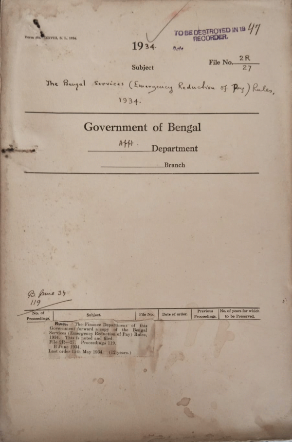 | Rack No. 2, Bundle No. 7, Sl No. 405 Summer powers of Mr. D.L. Mazumdar, I.C.S. Joint Magistrate, and S.D.O., Serajganj, Dacca. | Rack No. 2, Bundle No. 7, Sl No. 406 Powers of Mulvi Fazlul Karim Sub-Deputy Magistrate, Katwa, Burdwan, u/s. 164(i) of the criminal procedure code. | Rack No. 2, Bundle No. 7, Sl No. 407 Extension of leave of Mr. M.D. Cleary, I.P. Superintendent of Police, Chittagong. | Rack No. 2, Bundle No. 7, Sl No. 408 The Bengal Services (Emergency Reduction of Pay) Rules, 1934. | Rack No. 2, Bundle No. 7, Sl No. 409 Transfer of Capt. J.H.C. Hunt, M.I.O. Chittagong to Noakhali. | Rack No. 2, Bundle No. 7, Sl No. 410 Third Class powers of Mulvi Abdul Majid, Sub-Deputy Magistrates, Bogra. | Rack No. 2, Bundle No. 8, Sl No. 411 System of reservation of seats in elections for particular communities in Bombay and Madras. |